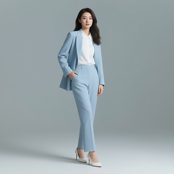 在职场时尚的版图里,一套剪裁精妙的职业装,是女性征战商海的绝佳战衣。而眼前这套浅蓝修身职业装,更是其中的佼佼者,以其独特魅力,重新定义职场风尚。 浅蓝,这一色调如春日晴空,清新而宁静。它摆脱了传统职业装色彩的沉闷,带来一股沁人心脾的气息。相较于黑白灰的经典色调,浅蓝多了几分柔和与亲和力,却又不失专业感。在忙碌的办公环境中,身着浅蓝职业装,仿佛自带舒缓磁场,能让紧张的氛围得到缓解,让人在工作中也能感受到如沐春风的惬意。 修身的剪裁,是这套职业装的灵魂所在。它精准贴合女性身体曲线,不松垮也不过于紧绷。肩部线条流畅自然,恰到好处的垫肩设计,微微拓宽肩部,营造出挺拔身姿,展现出女性的自信与从容。一粒扣或双粒扣的设计,简约中透着精致,扣上时,勾勒出纤细腰身,凸显女性柔美;敞开时,又增添了几分随性与大气。同色系的西裤,笔直的线条从腰部延伸至脚踝,不仅拉长腿部比例,更强化了整体的利落感。 内搭一件简约的白色衬衫,经典的搭配永不过时。白色衬衫的纯净与浅蓝职业装相互映衬,形成简洁而高级的视觉效果。领口微微敞开,露出精致的项链,不经意间增添一丝细节之美。脚上搭配一双蓝色尖头高跟鞋,鞋面上精致的金属扣装饰,为整体造型增添亮点,同时也与服装色彩呼应,进一步提升气场。 这套浅蓝修身职业装,不仅仅是衣物的组合,更是一种职场态度的表达。它让女性在会议室里,能够自信地陈述观点,用专业与智慧赢得尊重;在商务洽谈中,以优雅的形象和强大的气场,展现出不卑不亢的态度。它是职场女性的时尚利器,既承载着职业的严肃与专业,又释放着女性的温柔与魅力,助力她们在职业道路上绽放独特光芒,书写属于自己的精彩篇章。